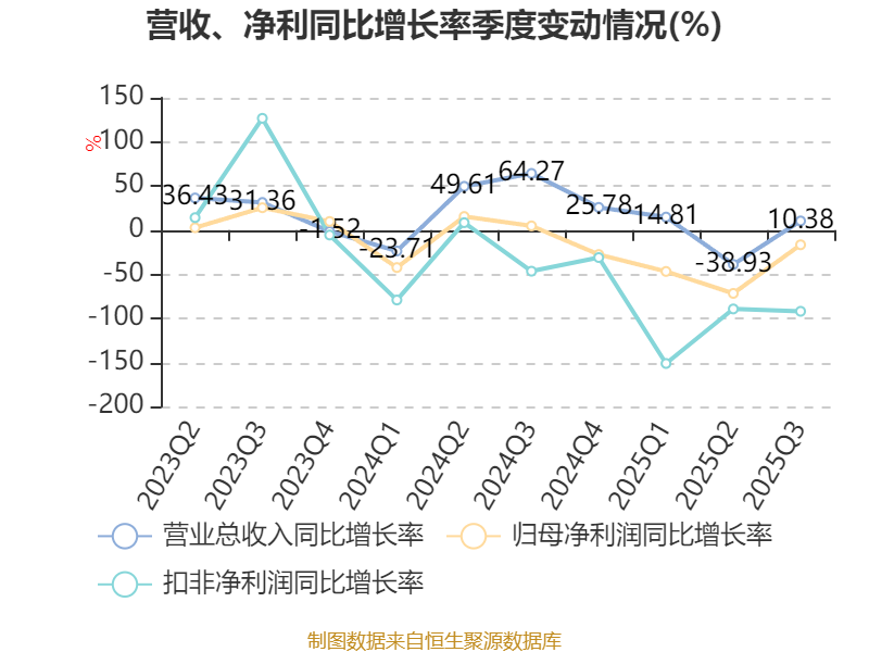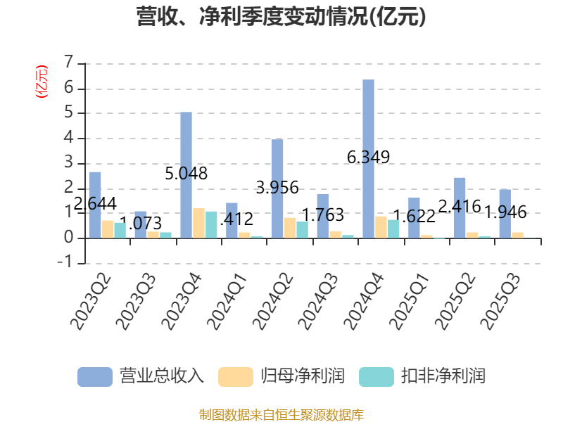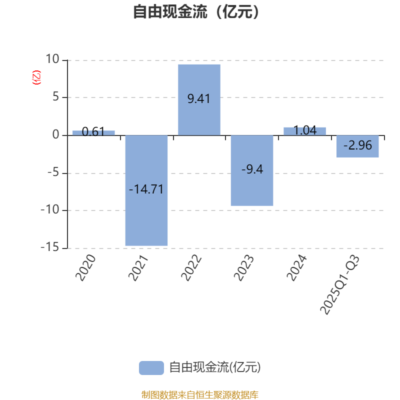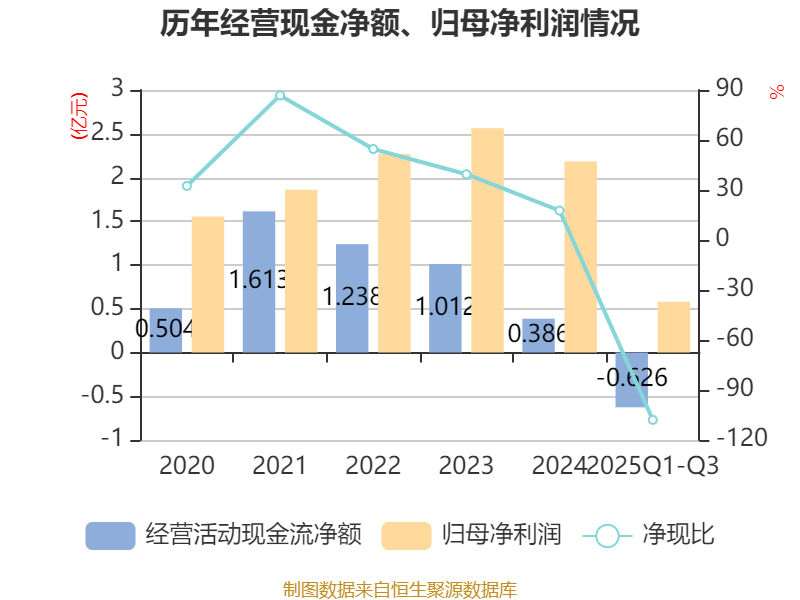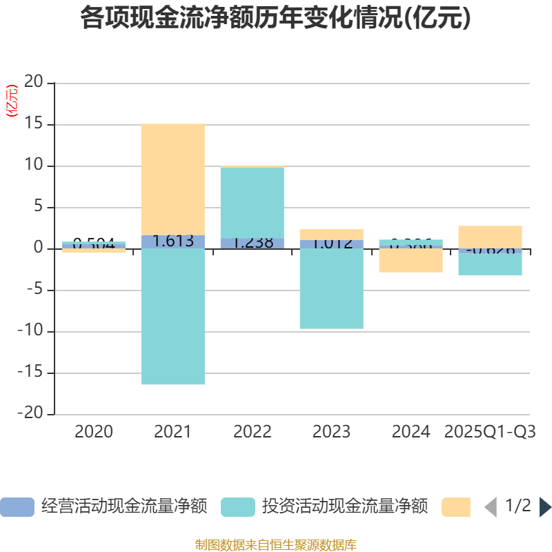 2025年前三季度,公司经营活动现金流净额为-6263.2万元,同比减少1.04亿元;筹资活动现金流净额2.73亿元,同比增加5.28亿元;投资活动现金流净额-2.63亿元,上年同期为-185.57万元。