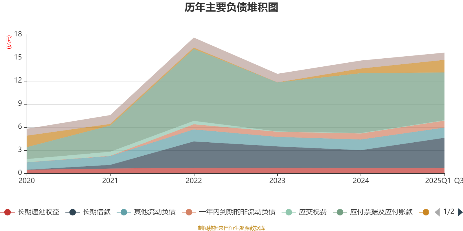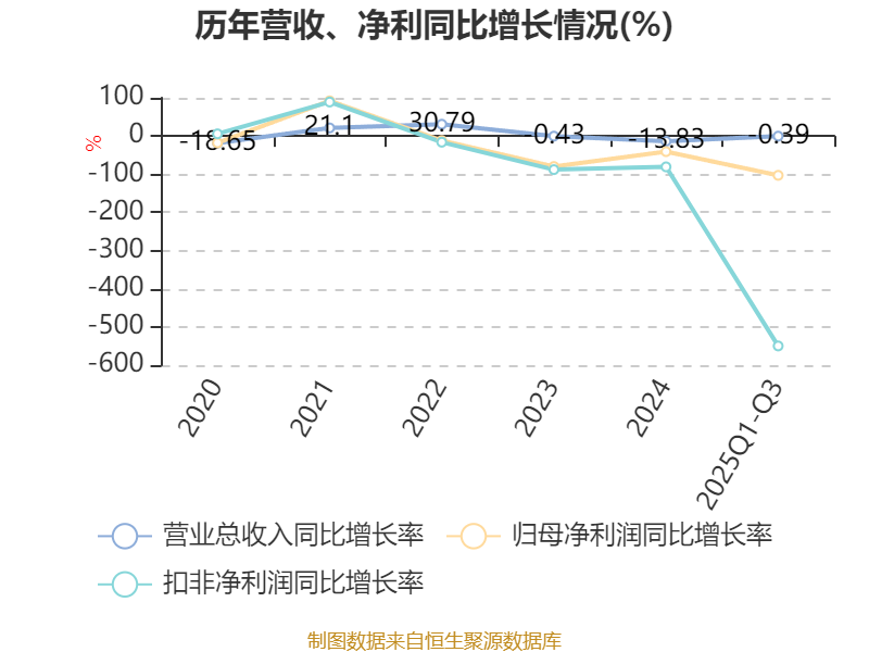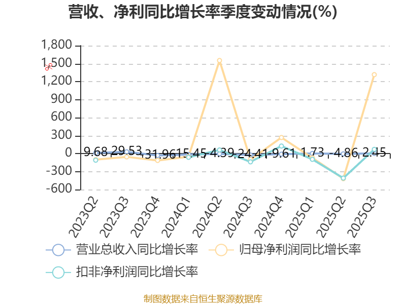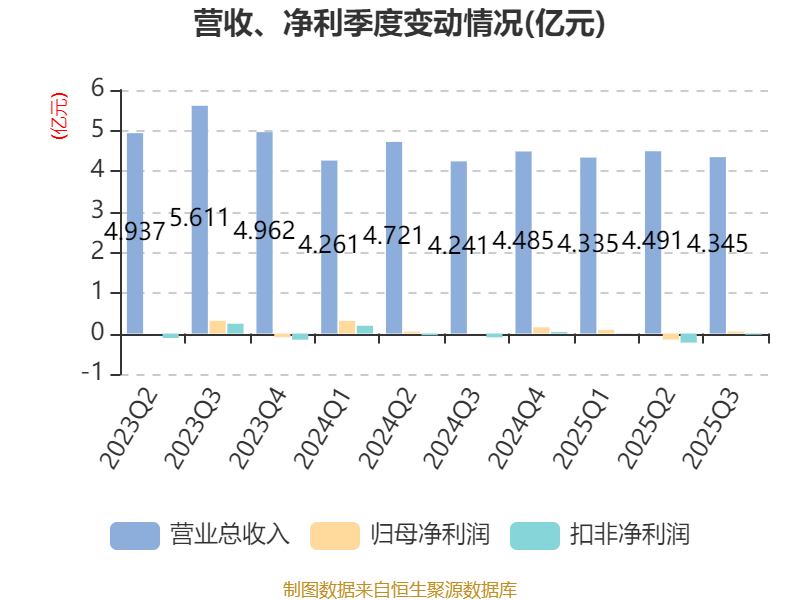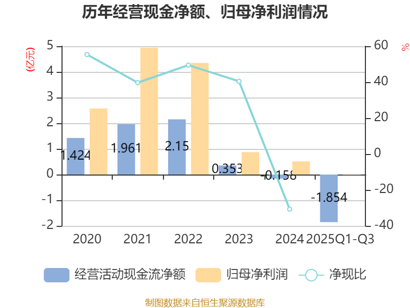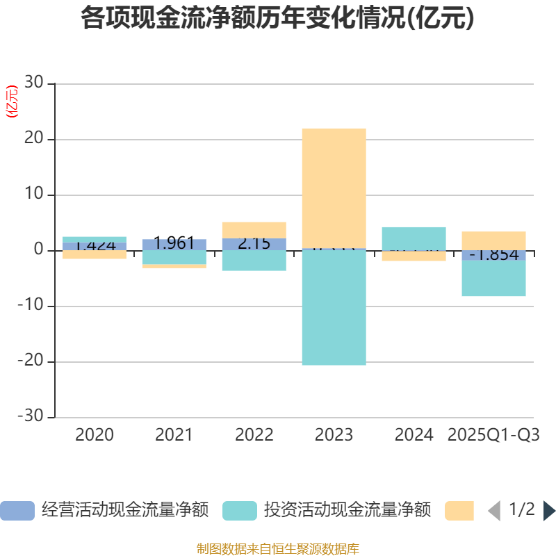 2025年前三季度,公司经营活动现金流净额为-1.85亿元,同比减少1.76亿元;筹资活动现金流净额3.36亿元,同比增加5.09亿元;投资活动现金流净额-6.42亿元,上年同期为6.54亿元。