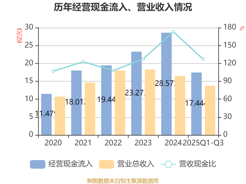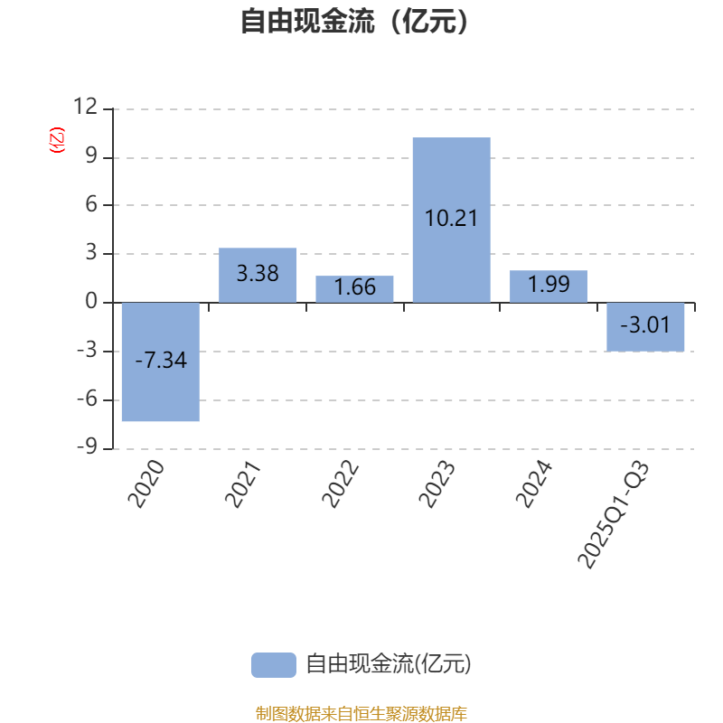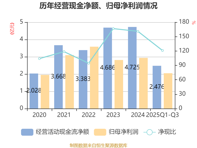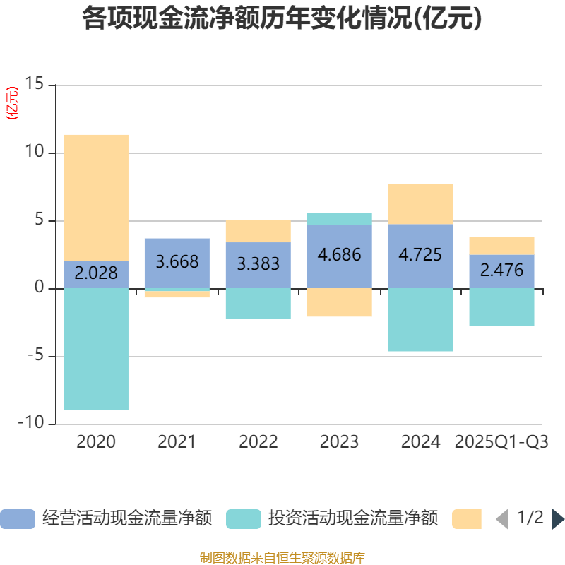 2025年前三季度,公司经营活动现金流净额为2.48亿元,同比下降4.32%;筹资活动现金流净额1.29亿元,同比减少2.23亿元;投资活动现金流净额-2.79亿元,上年同期为-4.01亿元。