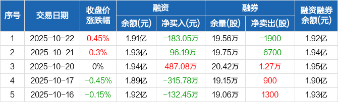 融资方面,当日融资买入685.18万元,融资偿还868.23万元,融资净偿还183.05万元。融券方面,融券卖出1700股,融券偿还3600股,融券余量19.56万股,融券余额130.47万元。融资融券余额合计1.92亿元。