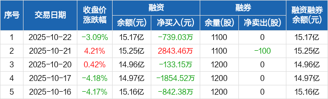 融资方面,当日融资买入2178.47万元,融资偿还2917.5万元,融资净偿还739.03万元。融券方面,融券卖出100股,融券偿还100股,融券余量1100股,融券余额5.6万元。融资融券余额合计15.17亿元。