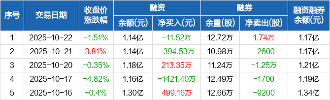 融资方面,当日融资买入1275.04万元,融资偿还1286.56万元,融资净偿还11.52万元。融券方面,融券卖出1.91万股,融券偿还1700股,融券余量12.72万股,融券余额365.7万元。融资融券余额合计1.17亿元。
