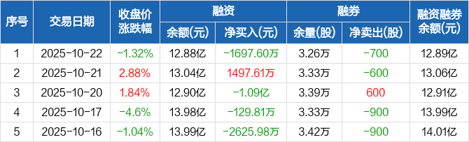 融资方面,当日融资买入7451.67万元,融资偿还9149.27万元,融资净偿还1697.6万元。融券方面,融券卖出500股,融券偿还1200股,融券余量3.26万股,融券余额132.06万元。融资融券余额合计12.89亿元。