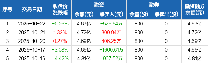 融资方面,当日融资买入1292.4万元,融资偿还1818.94万元,融资净偿还526.54万元。融券方面,融券卖出0股,融券偿还0股,融券余量800股,融券余额3056元。融资融券余额合计4.67亿元。