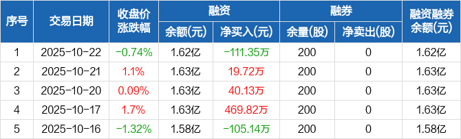 融资方面,当日融资买入172.64万元,融资偿还283.99万元,融资净偿还111.35万元。融券方面,融券卖出0股,融券偿还0股,融券余量200股,融券余额4576元。融资融券余额合计1.62亿元。