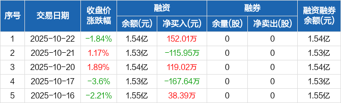 融资方面,当日融资买入650.99万元,融资偿还498.98万元,融资净买入152.01万元。融券方面,融券卖出0股,融券偿还0股,融券余量0股,融券余额0元。融资融券余额合计1.54亿元。