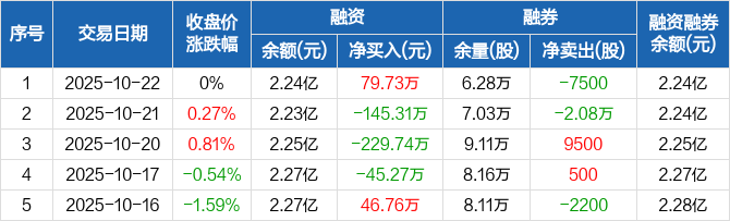 融资方面,当日融资买入404.41万元,融资偿还324.68万元,融资净买入79.73万元。融券方面,融券卖出1000股,融券偿还8500股,融券余量6.28万股,融券余额23.42万元。融资融券余额合计2.24亿元。