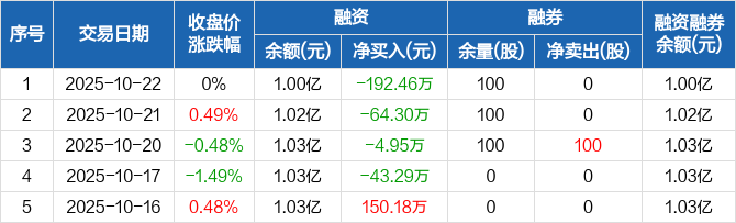 融资方面,当日融资买入192.93万元,融资偿还385.39万元,融资净偿还192.46万元,连续4日净偿还累计305万元。融券方面,融券卖出0股,融券偿还0股,融券余量100股,融券余额1450元。融资融券余额合计1亿元。