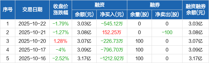 融资方面,当日融资买入1084.74万元,融资偿还1629.87万元,融资净偿还545.12万元。融券方面,融券卖出0股,融券偿还0股,融券余量0股,融券余额0元。融资融券余额合计3.03亿元。