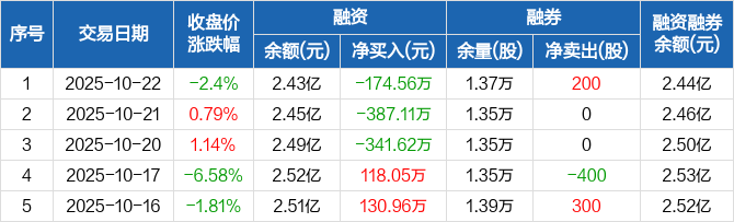 融资方面,当日融资买入803.97万元,融资偿还978.52万元,融资净偿还174.56万元,连续3日净偿还累计903.28万元。融券方面,融券卖出200股,融券偿还0股,融券余量1.37万股,融券余额71.99万元。融资融券余额合计2.44亿元。