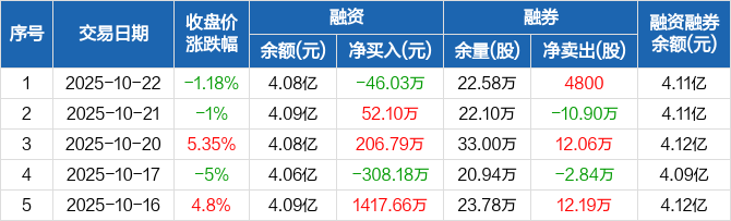 融资方面,当日融资买入2662.99万元,融资偿还2709.01万元,融资净偿还46.03万元。融券方面,融券卖出5900股,融券偿还1100股,融券余量22.58万股,融券余额265.32万元。融资融券余额合计4.11亿元。