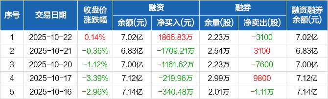 融资方面,当日融资买入4063.92万元,融资偿还2197.1万元,融资净买入1866.83万元。融券方面,融券卖出0股,融券偿还3100股,融券余量2.23万股,融券余额31.31万元。融资融券余额合计7.02亿元。