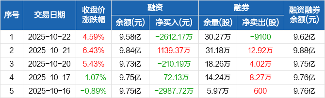 融资方面,当日融资买入8201.53万元,融资偿还1.08亿元,融资净偿还2612.17万元。融券方面,融券卖出0股,融券偿还9100股,融券余量30.27万股,融券余额392.9万元。融资融券余额合计9.62亿元。