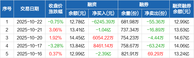 融资方面,当日融资买入1.98亿元,融资偿还2.6亿元,融资净偿还6245.39万元。融券方面,融券卖出26.72万份,融券偿还82.08万份,融券余量681.98万份,融券余额2072.54万元。融资融券余额合计12.99亿元。