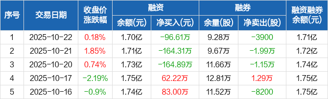 融资方面,当日融资买入128.6万元,融资偿还225.21万元,融资净偿还96.61万元,连续3日净偿还累计425.81万元。融券方面,融券卖出0股,融券偿还3900股,融券余量9.28万股,融券余额51.23万元。融资融券余额合计1.71亿元。