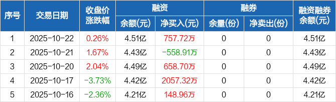 融资方面,当日融资买入3343.67万元,融资偿还2585.95万元,融资净买入757.72万元。融券方面,融券卖出0份,融券偿还0份,融券余量0份,融券余额0元。融资融券余额合计4.51亿元。