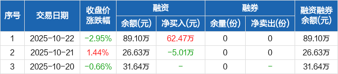 融资方面,当日融资买入84.52万元,融资偿还22.05万元,融资净买入62.47万元。融券方面,融券卖出0份,融券偿还0份,融券余量0份,融券余额0元。融资融券余额合计89.1万元。
