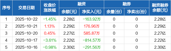 融资方面,当日融资买入2349.36万元,融资偿还2513.28万元,融资净偿还163.92万元。融券方面,融券卖出0份,融券偿还0份,融券余量0份,融券余额0元。融资融券余额合计2.28亿元。