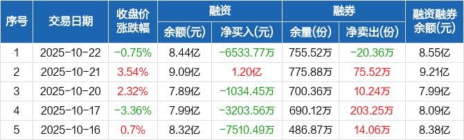 融资方面,当日融资买入1亿元,融资偿还1.66亿元,融资净偿还6533.77万元。融券方面,融券卖出0份,融券偿还20.36万份,融券余量755.52万份,融券余额1097.02万元。融资融券余额合计8.55亿元。