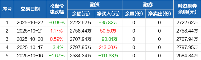 融资方面,当日融资买入300.56万元,融资偿还336.38万元,融资净偿还35.82万元。融券方面,融券卖出0份,融券偿还0份,融券余量0份,融券余额0元。融资融券余额合计2722.62万元。