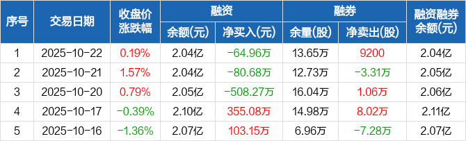 融资方面,当日融资买入488.39万元,融资偿还553.35万元,融资净偿还64.96万元,连续3日净偿还累计653.91万元。融券方面,融券卖出1.24万股,融券偿还3200股,融券余量13.65万股,融券余额70.98万元。融资融券余额合计2.04亿元。