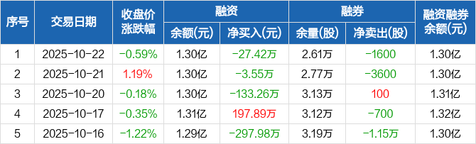 融资方面,当日融资买入349.81万元,融资偿还377.23万元,融资净偿还27.42万元,连续3日净偿还累计164.23万元。融券方面,融券卖出200股,融券偿还1800股,融券余量2.61万股,融券余额44.03万元。融资融券余额合计1.3亿元。