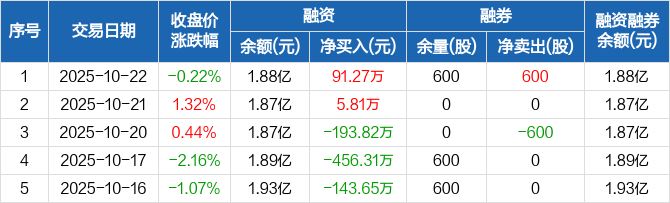 融资方面,当日融资买入699.33万元,融资偿还608.06万元,融资净买入91.27万元。融券方面,融券卖出600股,融券偿还0股,融券余量600股,融券余额2766元。融资融券余额合计1.88亿元。