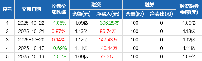 融资方面,当日融资买入238.58万元,融资偿还634.86万元,融资净偿还396.28万元。融券方面,融券卖出0股,融券偿还0股,融券余量100股,融券余额2880元。融资融券余额合计1.09亿元。