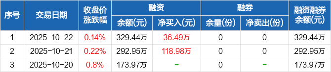融资方面,当日融资买入528.43万元,融资偿还491.94万元,融资净买入36.49万元。融券方面,融券卖出0份,融券偿还0份,融券余量0份,融券余额0元。融资融券余额合计329.44万元。