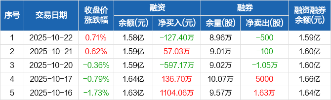 融资方面,当日融资买入776.89万元,融资偿还904.3万元,融资净偿还127.4万元。融券方面,融券卖出200股,融券偿还700股,融券余量8.96万股,融券余额101.79万元。融资融券余额合计1.59亿元。