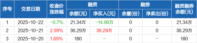 融资方面,当日融资买入21.39万元,融资偿还36.34万元,融资净偿还14.96万元。融券方面,融券卖出0份,融券偿还0份,融券余量0份,融券余额0元。融资融券余额合计21.34万元。