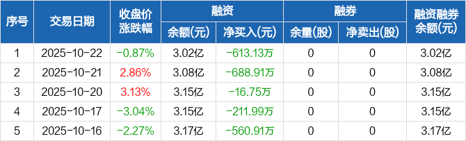 融资方面,当日融资买入1001.22万元,融资偿还1614.35万元,融资净偿还613.13万元,连续5日净偿还累计2091.69万元。融券方面,融券卖出0股,融券偿还0股,融券余量0股,融券余额0元。融资融券余额合计3.02亿元。