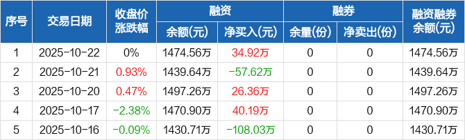 融资方面,当日融资买入80.61万元,融资偿还45.69万元,融资净买入34.92万元。融券方面,融券卖出0份,融券偿还0份,融券余量0份,融券余额0元。融资融券余额合计1474.56万元。