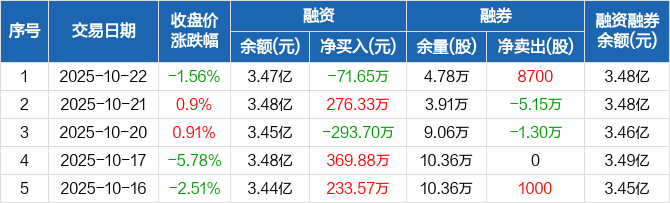 融资方面,当日融资买入687.71万元,融资偿还759.36万元,融资净偿还71.65万元。融券方面,融券卖出1.19万股,融券偿还3200股,融券余量4.78万股,融券余额21.08万元。融资融券余额合计3.48亿元。