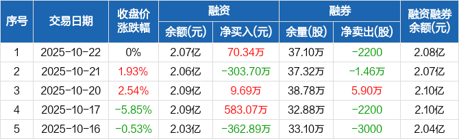 融资方面,当日融资买入1017.01万元,融资偿还946.67万元,融资净买入70.34万元。融券方面,融券卖出400股,融券偿还2600股,融券余量37.1万股,融券余额137.27万元。融资融券余额合计2.08亿元。