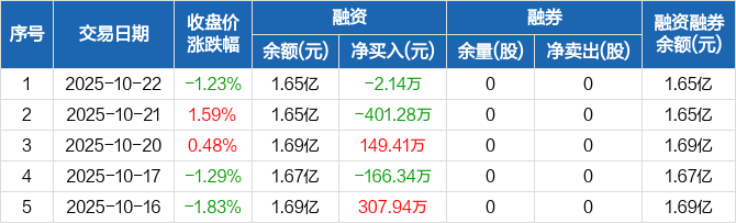 融资方面,当日融资买入980.5万元,融资偿还982.63万元,融资净偿还2.14万元。融券方面,融券卖出0股,融券偿还0股,融券余量0股,融券余额0元。融资融券余额合计1.65亿元。