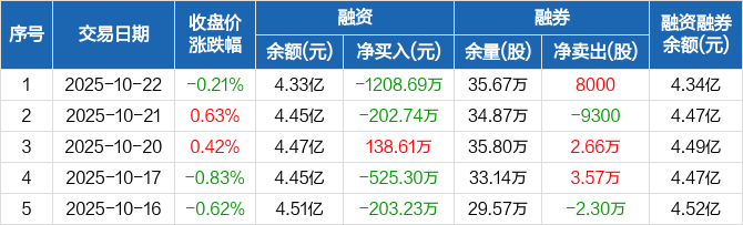 融资方面,当日融资买入1166.26万元,融资偿还2374.95万元,融资净偿还1208.69万元。融券方面,融券卖出1.2万股,融券偿还4000股,融券余量35.67万股,融券余额171.57万元。融资融券余额合计4.34亿元。