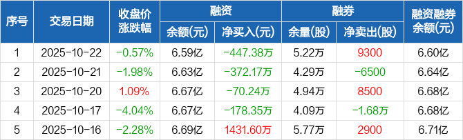 融资方面,当日融资买入1284.77万元,融资偿还1732.15万元,融资净偿还447.38万元,连续4日净偿还累计1068.14万元。融券方面,融券卖出1.08万股,融券偿还1500股,融券余量5.22万股,融券余额118.44万元。融资融券余额合计6.6亿元。