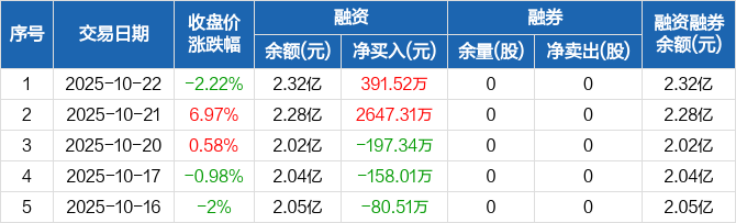 融资方面,当日融资买入4312.08万元,融资偿还3920.56万元,融资净买入391.52万元。融券方面,融券卖出0股,融券偿还0股,融券余量0股,融券余额0元。融资融券余额合计2.32亿元。
