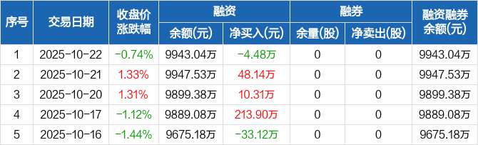 融资方面,当日融资买入333万元,融资偿还337.48万元,融资净偿还4.48万元。融券方面,融券卖出0股,融券偿还0股,融券余量0股,融券余额0元。融资融券余额合计9943.04万元。