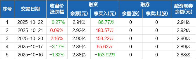 融资方面,当日融资买入238.15万元,融资偿还324.91万元,融资净偿还86.77万元。融券方面,融券卖出0股,融券偿还0股,融券余量0股,融券余额0元。融资融券余额合计2.91亿元。
