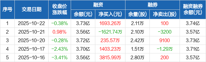 融资方面,当日融资买入3837.09万元,融资偿还2143.83万元,融资净买入1693.26万元。融券方面,融券卖出600股,融券偿还500股,融券余量2.11万股,融券余额60.35万元。融资融券余额合计3.74亿元。