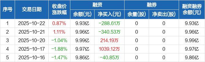 融资方面,当日融资买入1315.47万元,融资偿还1604.08万元,融资净偿还288.61万元。融券方面,融券卖出0股,融券偿还0股,融券余量0股,融券余额0元。融资融券余额合计9.93亿元。