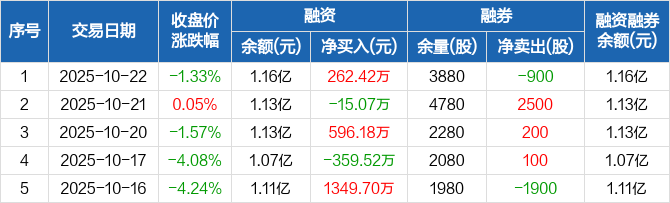 融资方面,当日融资买入708.28万元,融资偿还445.87万元,融资净买入262.42万元。融券方面,融券卖出100股,融券偿还1000股,融券余量3880股,融券余额24.48万元。融资融券余额合计1.16亿元。