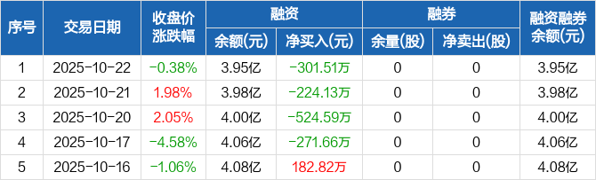 融资方面,当日融资买入1556.73万元,融资偿还1858.24万元,融资净偿还301.51万元,连续4日净偿还累计1321.89万元。融券方面,融券卖出0股,融券偿还0股,融券余量0股,融券余额0元。融资融券余额合计3.95亿元。
