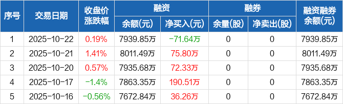 融资方面,当日融资买入208.7万元,融资偿还280.34万元,融资净偿还71.64万元。融券方面,融券卖出0股,融券偿还0股,融券余量0股,融券余额0元。融资融券余额合计7939.85万元。