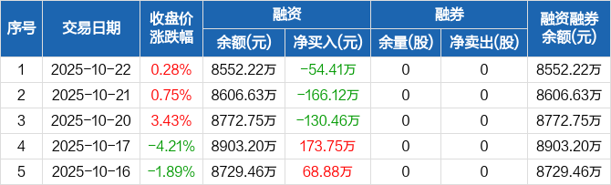 融资方面,当日融资买入166.37万元,融资偿还220.77万元,融资净偿还54.41万元,连续3日净偿还累计350.99万元。融券方面,融券卖出0股,融券偿还0股,融券余量0股,融券余额0元。融资融券余额合计8552.22万元。