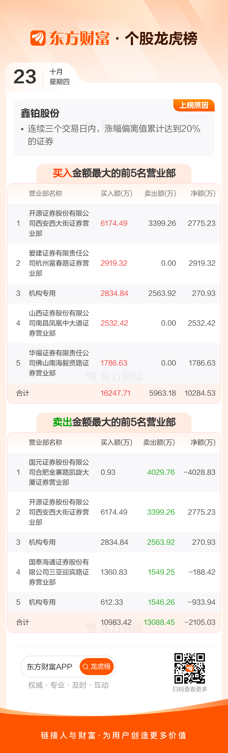 交易所2025年10月23日公布的交易公开信息显示,鑫铂股份因成为连续三个交易日内,涨幅偏离值累计达到20%的证券上榜。鑫铂股份当日收报19.73元,涨跌幅9.98%,换手率27.48%,成交额8.60亿。异常期间10月22日至10月23日,期间涨幅20.97%,累计偏离值21.18%,区间成交额12.85亿。
