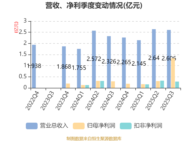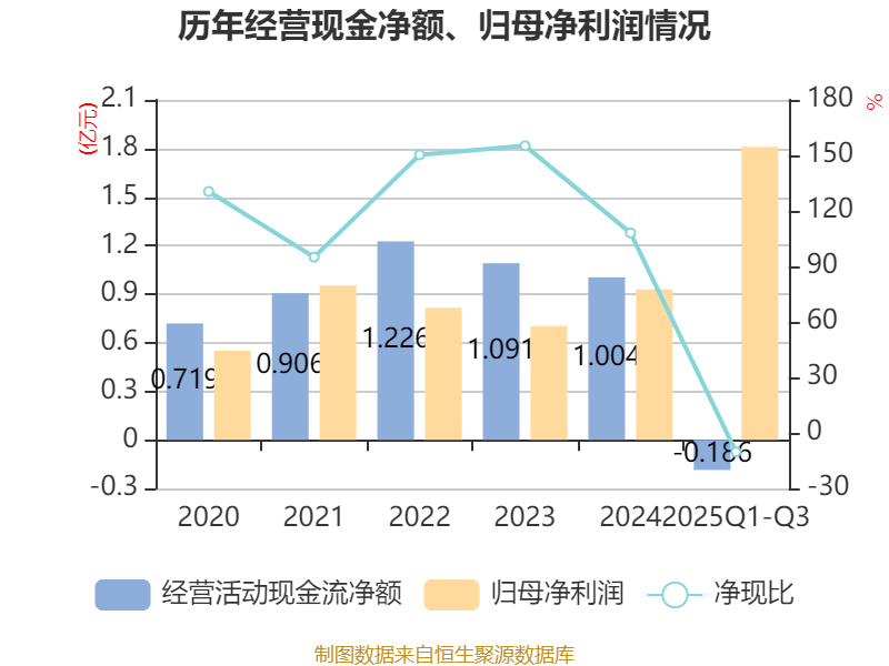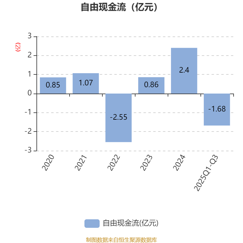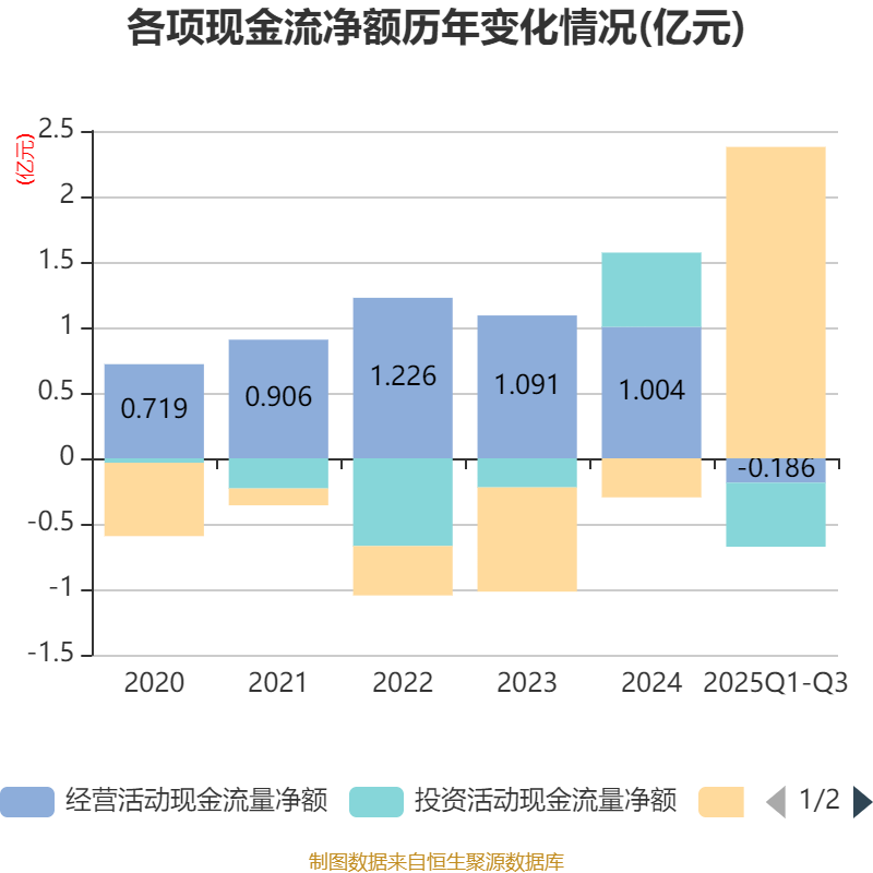 2025年前三季度,公司经营活动现金流净额为-1856.77万元,同比减少3624.21万元;筹资活动现金流净额2.38亿元,同比增加2.35亿元;投资活动现金流净额-4886.09万元,上年同期为-2974.61万元。
