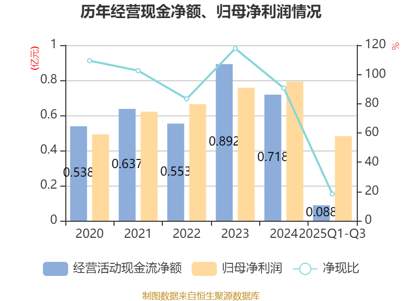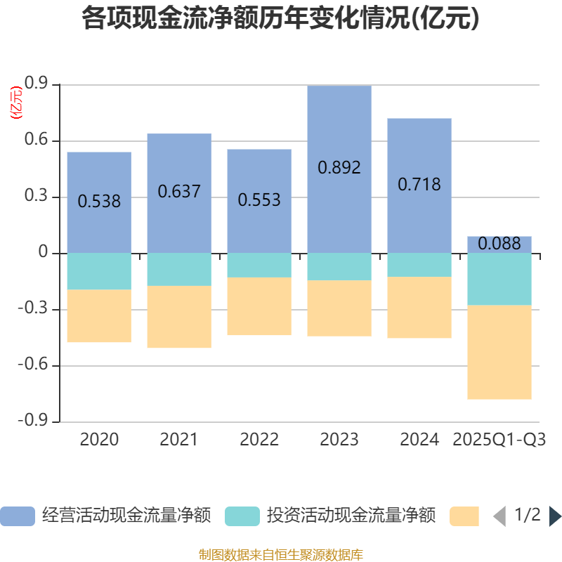2025年前三季度,公司经营活动现金流净额为882.61万元,同比下降49.97%;筹资活动现金流净额-5021.98万元,同比减少1269.58万元;投资活动现金流净额-2801.33万元,上年同期为-1091.64万元。